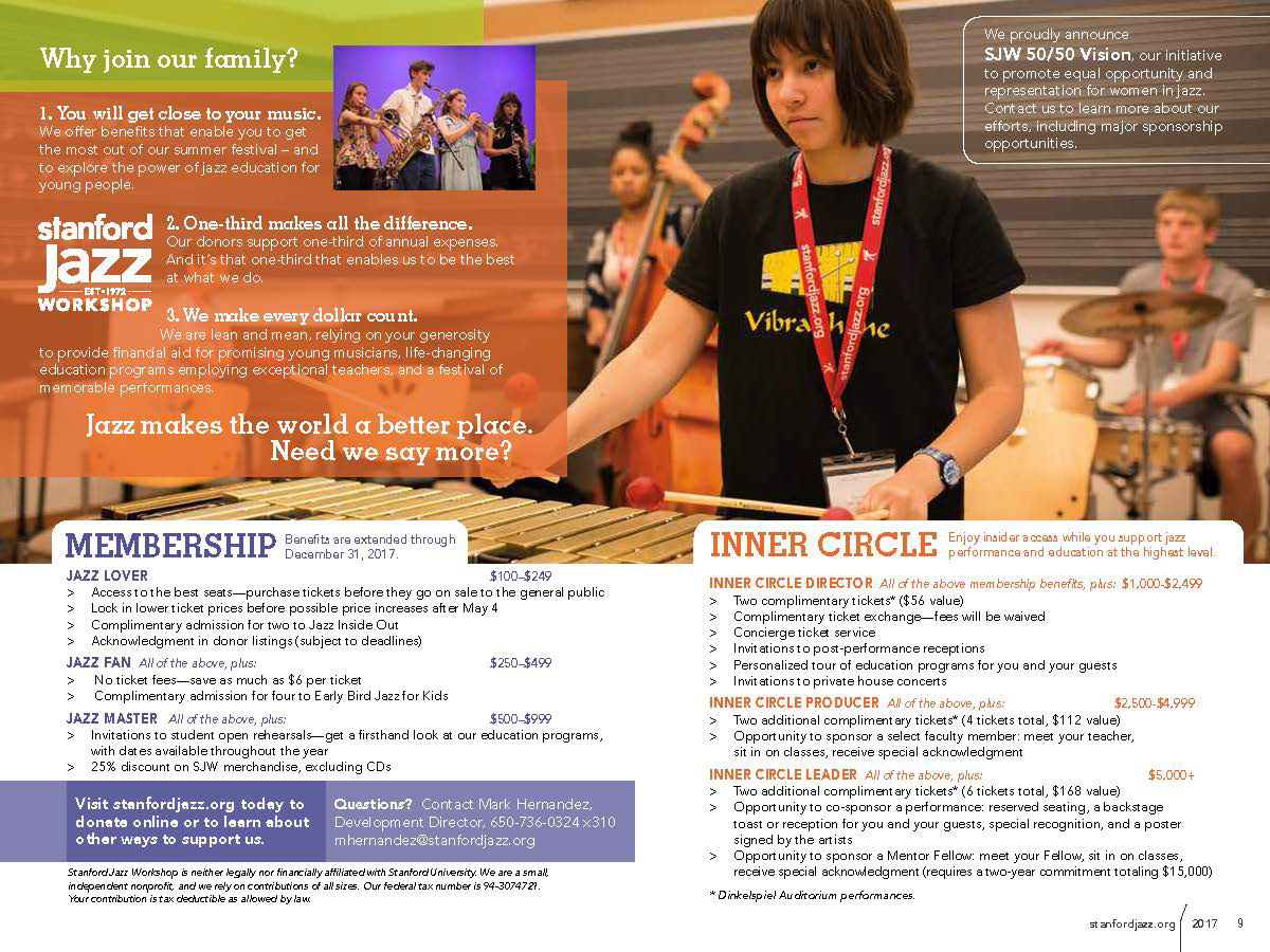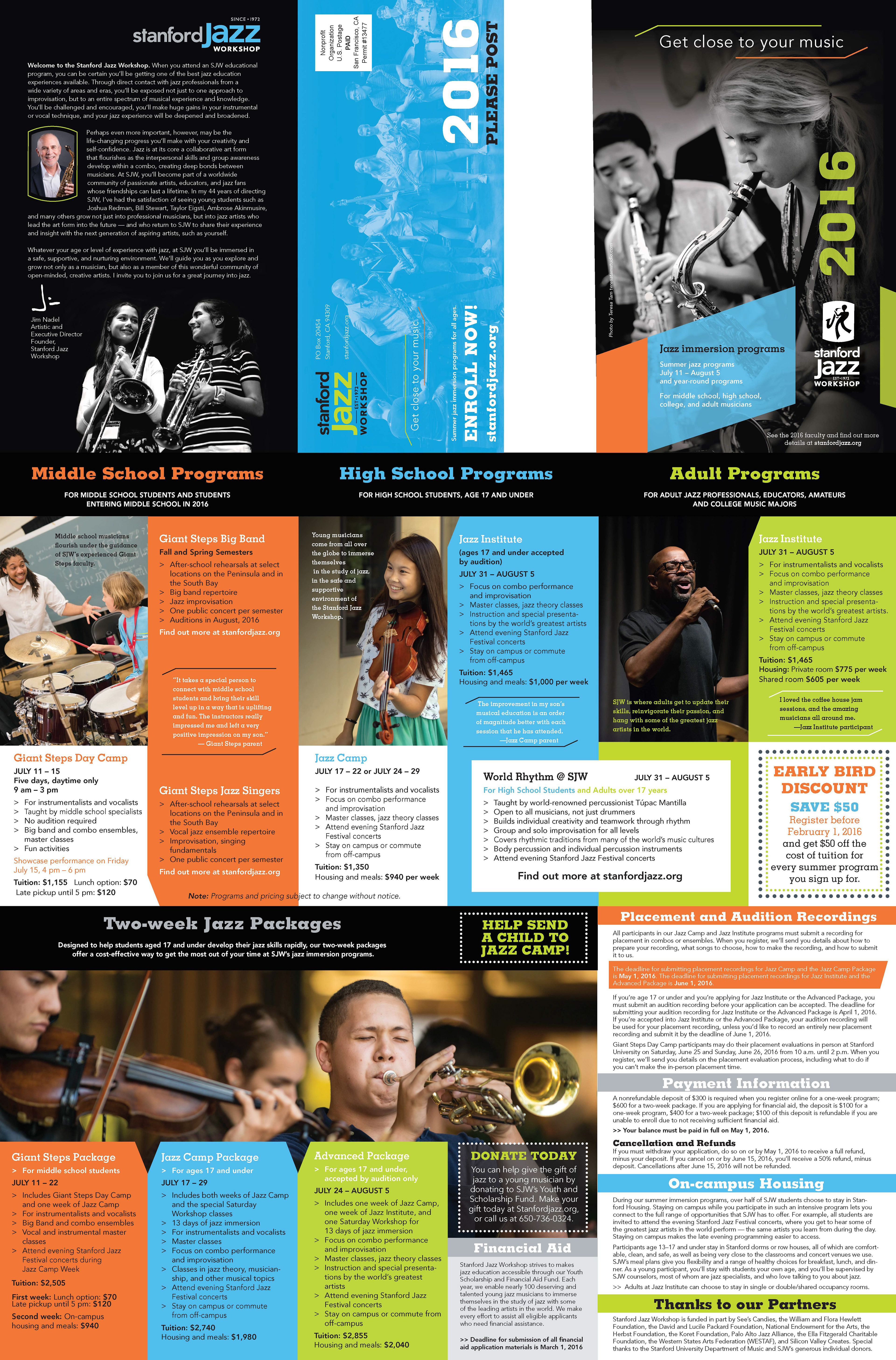 My relationship with Stanford Jazz stemmed from my work with the Jeff Babcock, former Director of the Scottsdale Center for the Performing Arts. Jeff Babcocks' challenge as the new Director at The Stanford Jazz Workshop was to take an amazing educational program that had the name "Stanford" and took place on the Stanford University Campus during the summer, but wanted to expand the awareness of SJW throughout the Bay Area and beyond. I reached out to my branding colleague Jeff Miraglia with Mindset, Inc. and together we stepped into to give Stanford Jazz Workshop a brand voice, identity and visuals that would support the jazz curriculum, faculty, and resident artists.